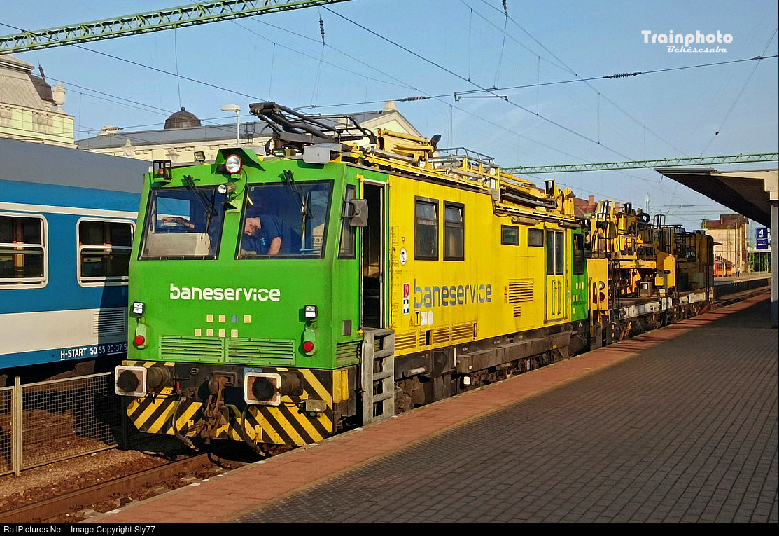 A railway maintenance vehicle passes through Békéscsaba railway station.