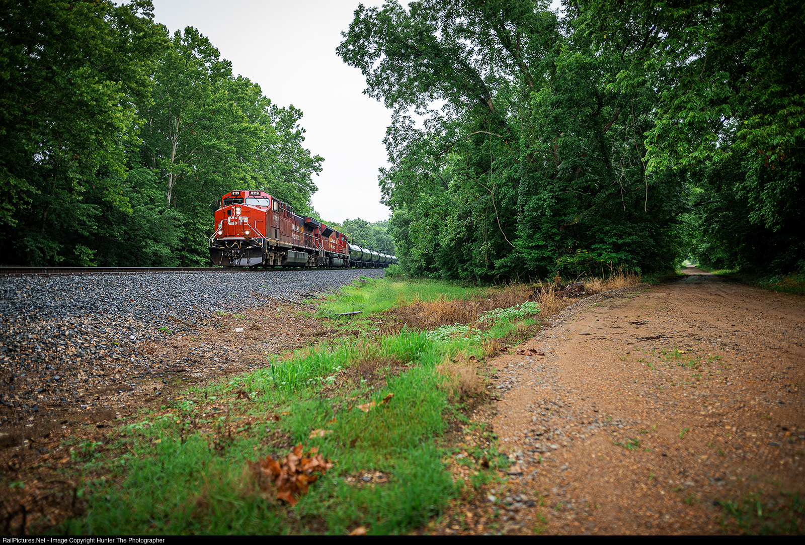 | A pair of Canadian Pacific engines lead northbound empty crude oil train Q577 past a seldom-used dirt road near Watts, OK on a rainy Sunday, July 9, 2023 morning.