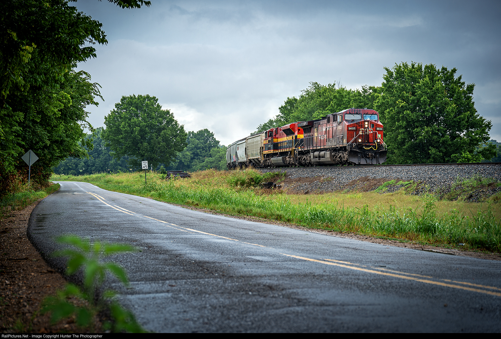 | A couple of miles south of Stilwell, OK, a bruised-up AC4400CW and a much cleaner SD70ACe lead a southbound train loaded with grain in a light rain on the morning of Sunday, July 9, 2023.