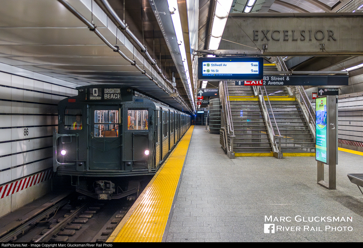 Beach Bound, Coney Island. On Saturday, July 8, 2023, the sold out New York Transit Museum R-9 "Beach Bound, Coney Island" was operated to the delight of passengers and subway fans. This is the first of several ticketed "Nostalgia Specials" that will be operated this year in addition to a program of regular fare admission events. The R-9 class was composed of 11 orders that produced 1,703 passenger cars (and several additional orders for non-revenue cars) built by American Car and Foundry (ACF), Pullman, and Pressed Steel for the City of New York and Board of Transportation with minor variations from 1930-1940 and operated until the last car was retired from revenue service in March 31, 1977. Today, there are still a number of them that alternate between operating and stationary display for the Transit Museum, as well as permanent residents of other museums. The train is passing through the 86 Street-2nd Avenue Station before the excursion began for the day.