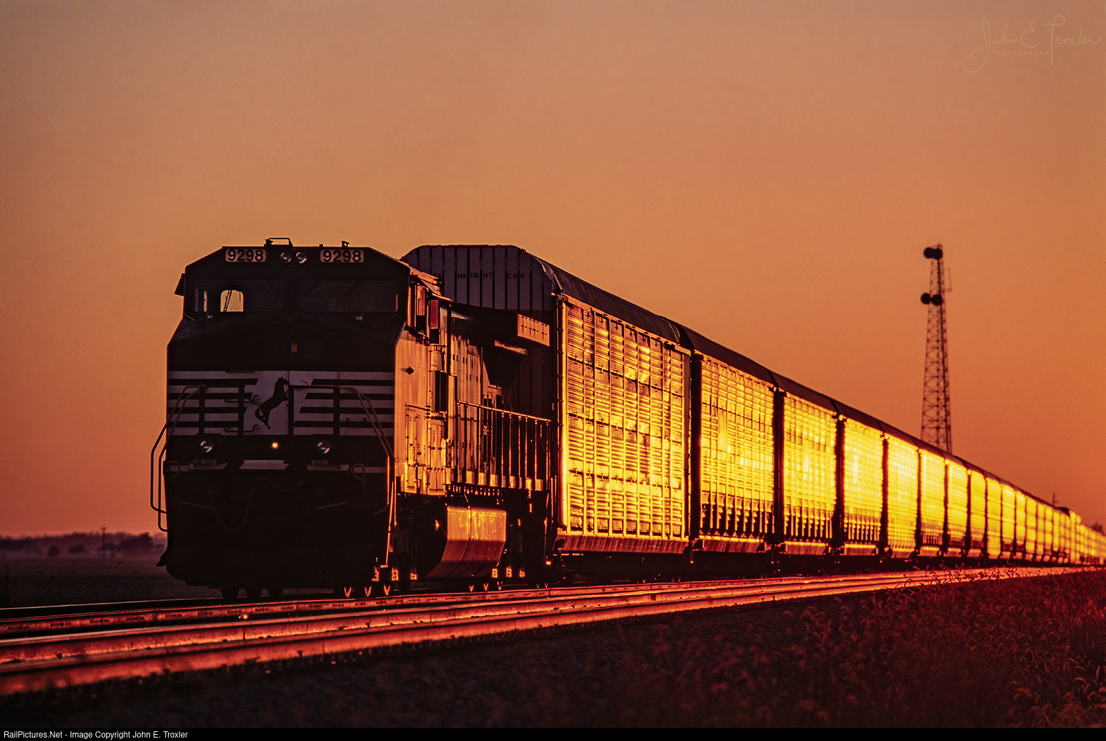 | Norfolk Southern eastbound rack train is parked in the siding at Clymers, IN at sunset waiting out the New Years holiday on 12/31/99. I remember this day well. The Y2K scare was rampant in the world which turned out to be a non-event when the clock turned over to 2000 since businesses and governments were well prepared to prevent potential disaster. New computer sales skyrocketed during 1999, lol! |