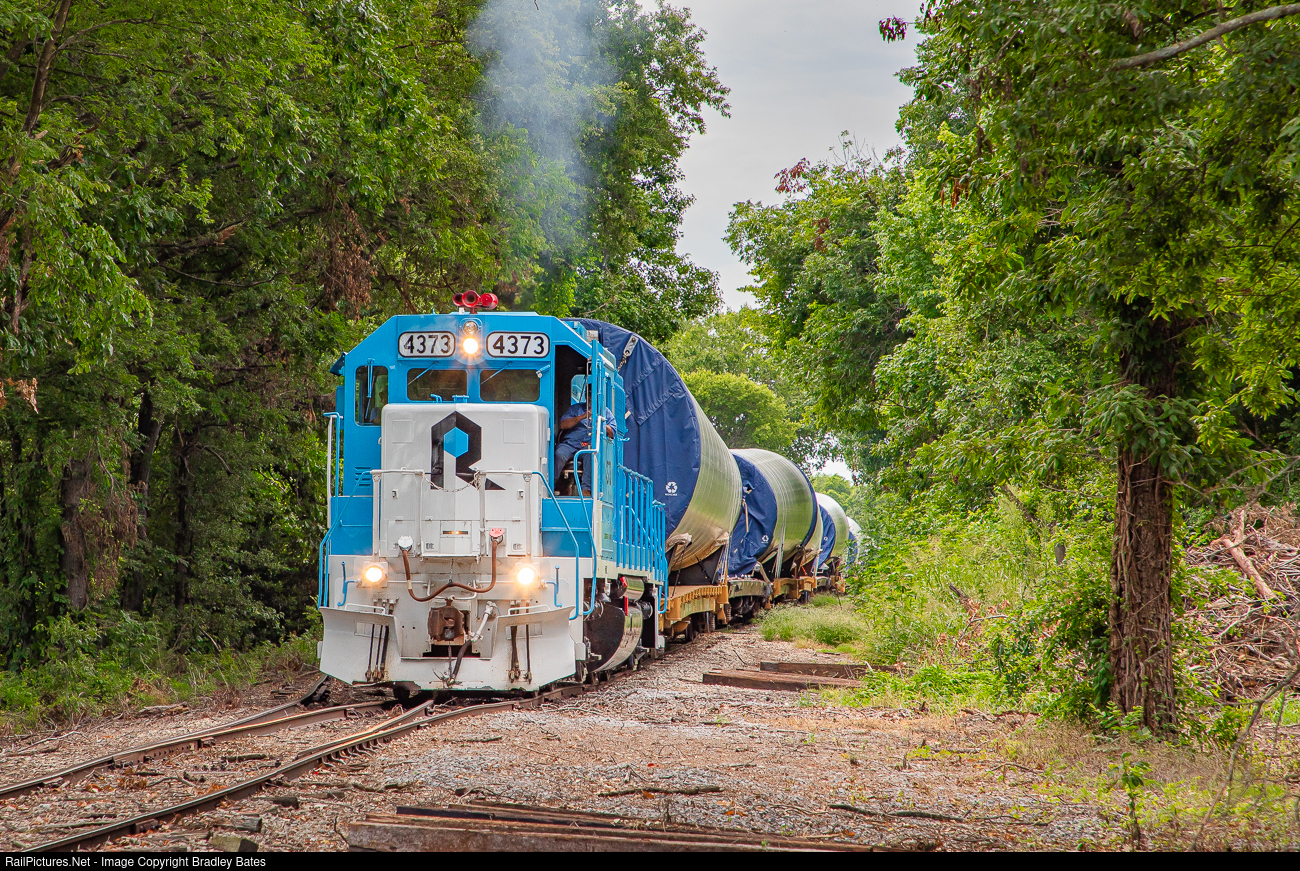 Rock Island Rail GP38 #4373 leads a wind mill tower train north through Dublin, MS., bound for Vestas Transload Terminal in Clarksdale.