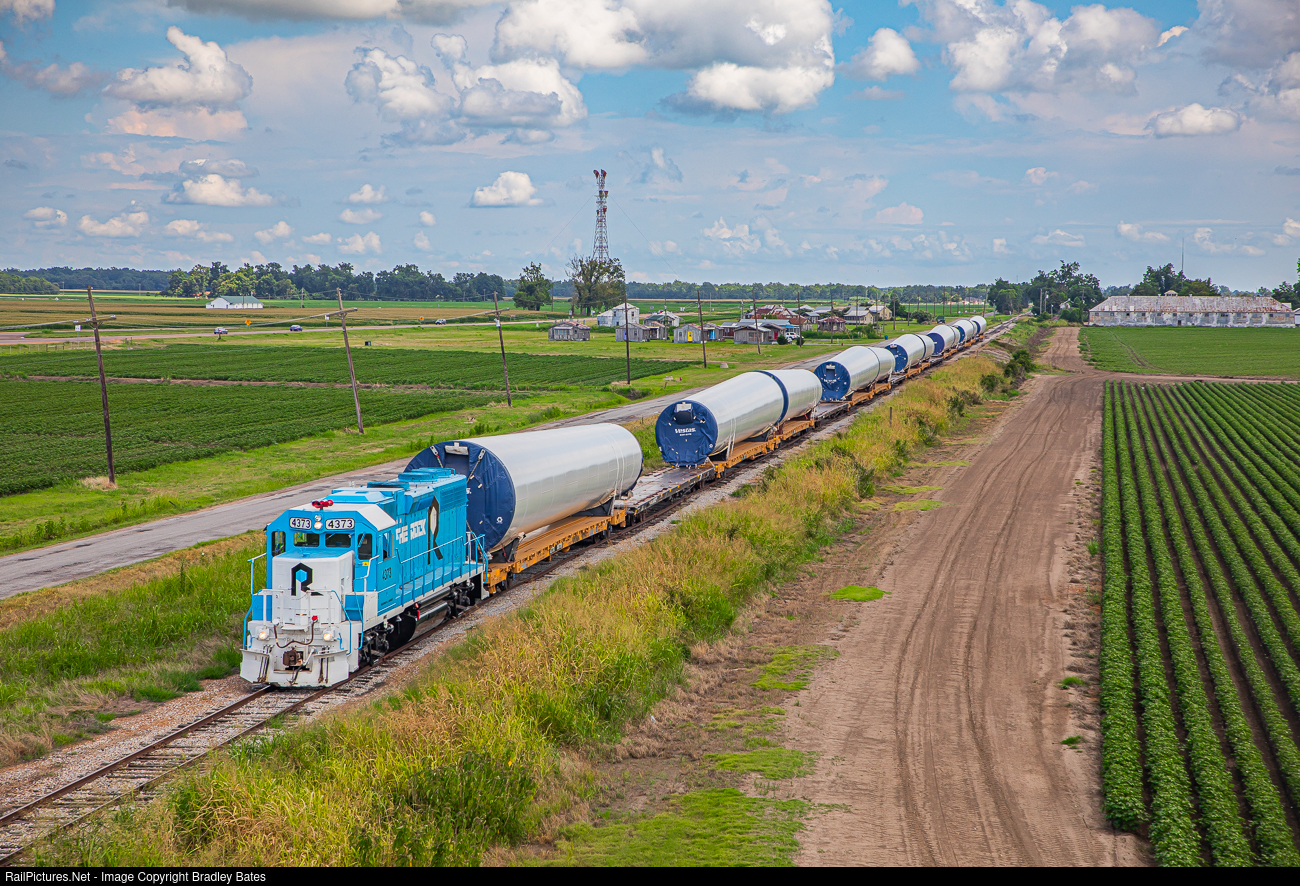 | Rock Island Rail GP38 #4373 leads a wind mill tower train north into Clarksdale, MS., bound for Vestas Transload Terminal about a mile ahead. |