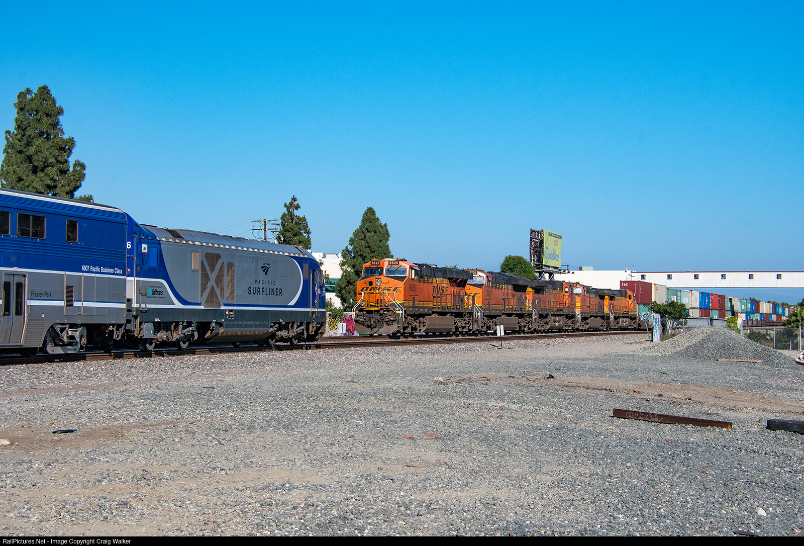 As BNSF's S-LPCLBE1-02L (Intermodal Stacks; Logistics Park Chicago IL to Long Beach CA) awaits a fresh crew, Amtrak Pacific Surfliner 784 (Goleta CA to Irvine CA, truncated from going to San Diego due to another landslide in San Clemente on 06/05/23) heads east/south. (Buena Park, California – July 7, 2023)