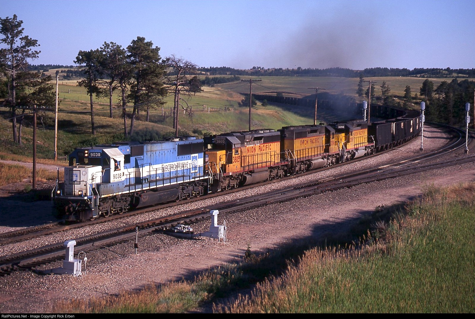 BN leased 100 SD60s in 1986. The units were frequently seen on coal trains, although customarily in the company of other Oakway units or BN green SD40-2s and C30-7s. Yet here one of the Oakways leads a set of UP SD40-2s bringing empty hoppers over the summit at Belmont, NE. My guess is that this is a Jeffrey, KS coal train as these outfits loaded on BN near Gillette, WY but had to traverse UP from Northport, NE to their destination, thus the trains had power from both roads although usually just a UP leader for cab signals between Northport and Jeffrey.