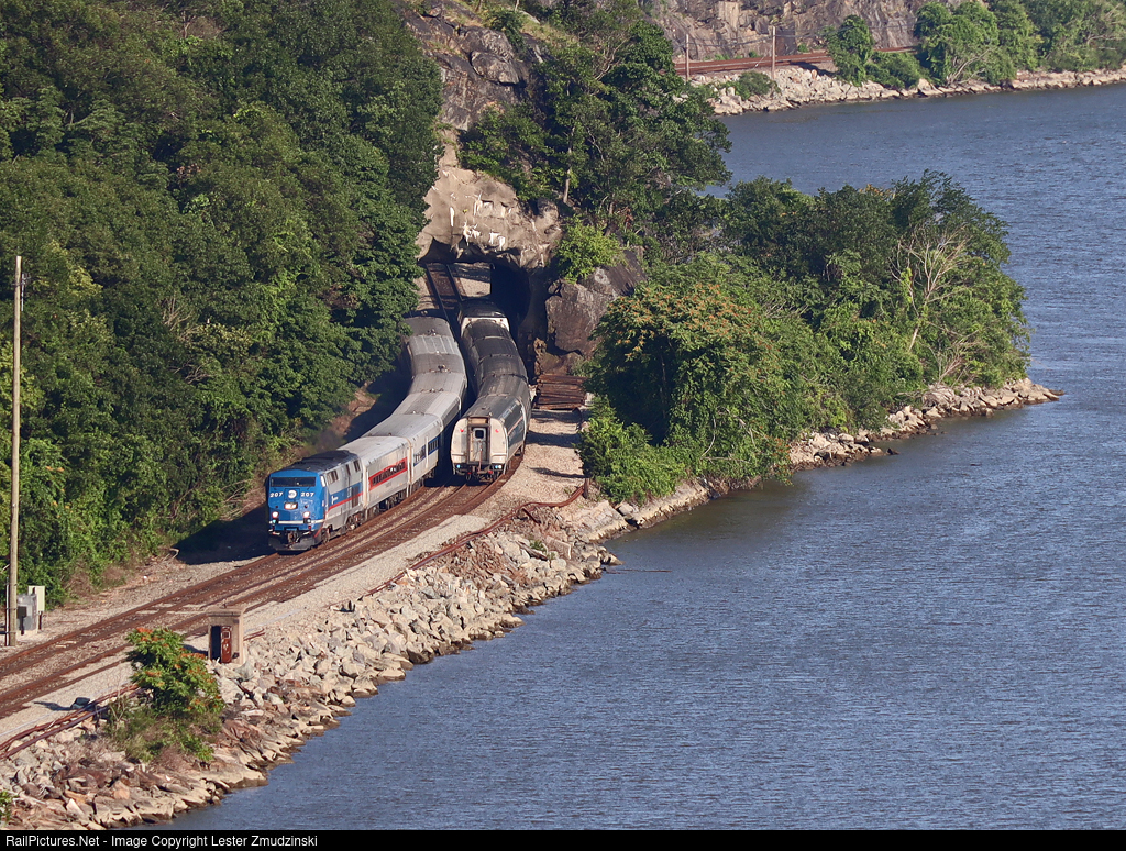 A meet at one of the tunnels found along the east bank of the Hudson. Amtrak heading south; Metro North north.