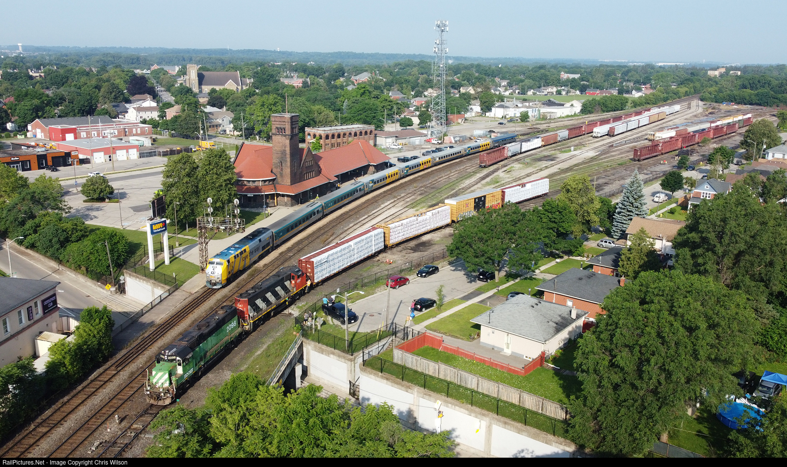 Windsor, ON - Toronto, ON VIA Rail Canada train 70 makes a brief stop at the iconic Brantford station as CN train L58031 05 switches in the yard.