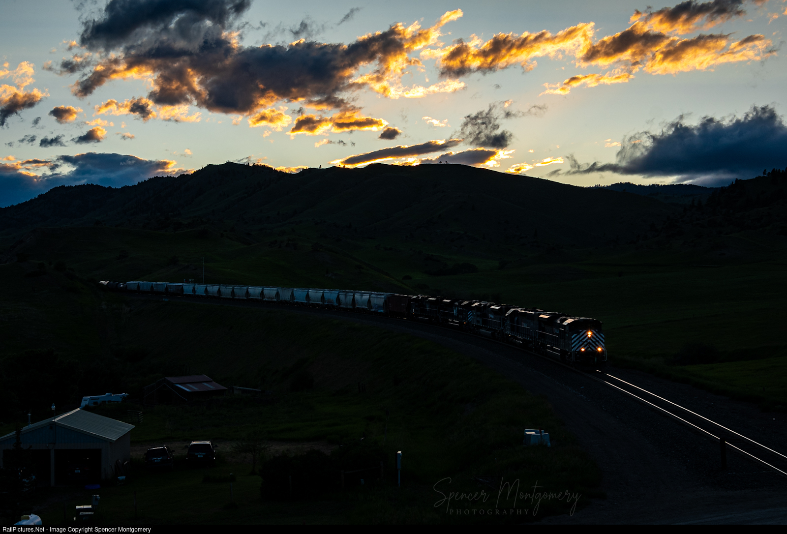 The sun has fallen below the mountains as MRLs Missoula to Laurel manifest descends Bozeman Pass.