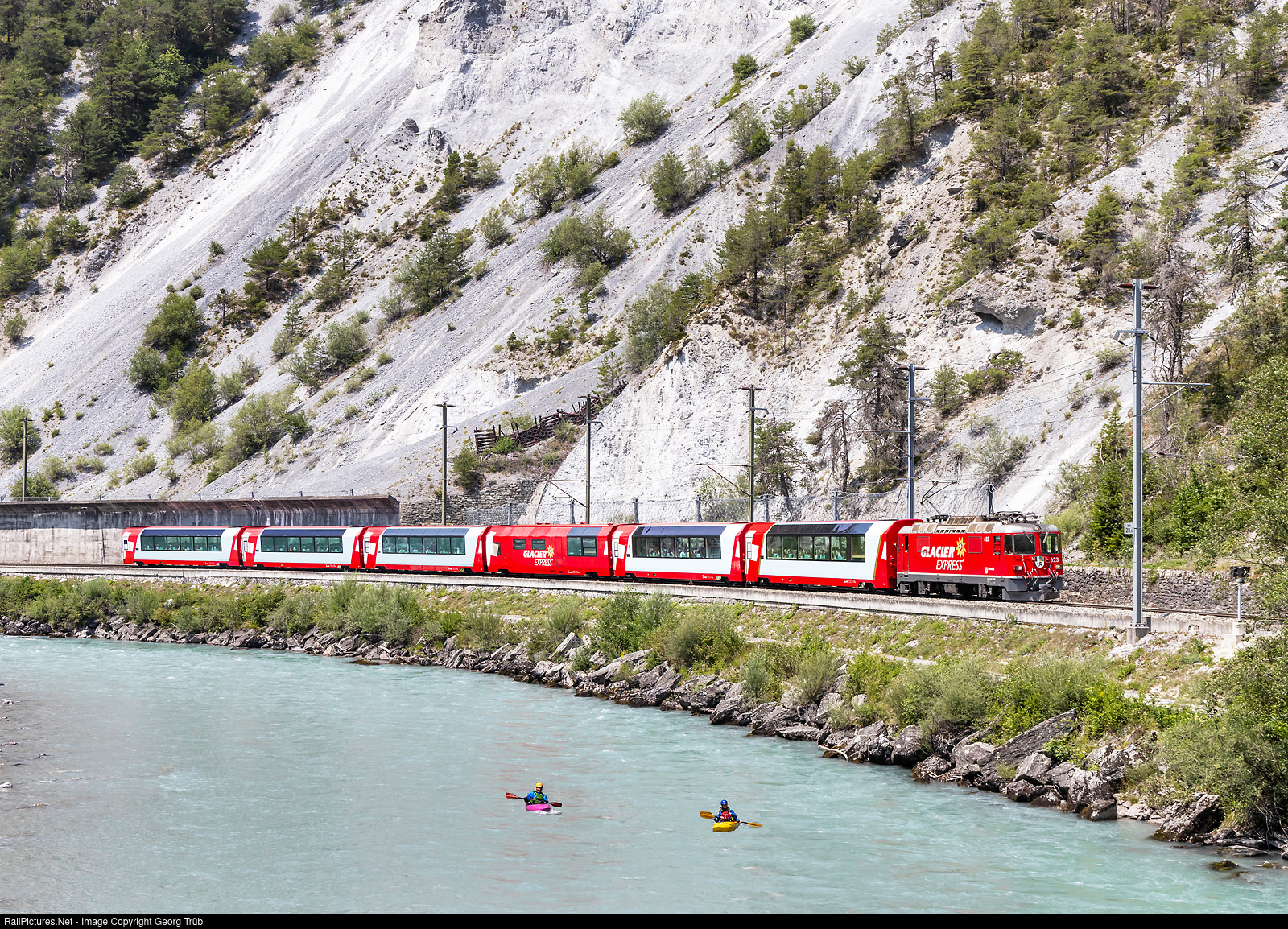 | Ge 4/4 II # 623 of the Rhaetian Railway, in the matching paint scheme, pulls the PE 902 GLACIER EXPRESS Zermatt-St.Moritz, on the section between Disentis/Mustér and Chur, through the Ruinaulta gorge along the Vorderrhein between Versam-Safien and Trin. First car is of the Excellence class. Rafting and canoeing are very popular here. |
