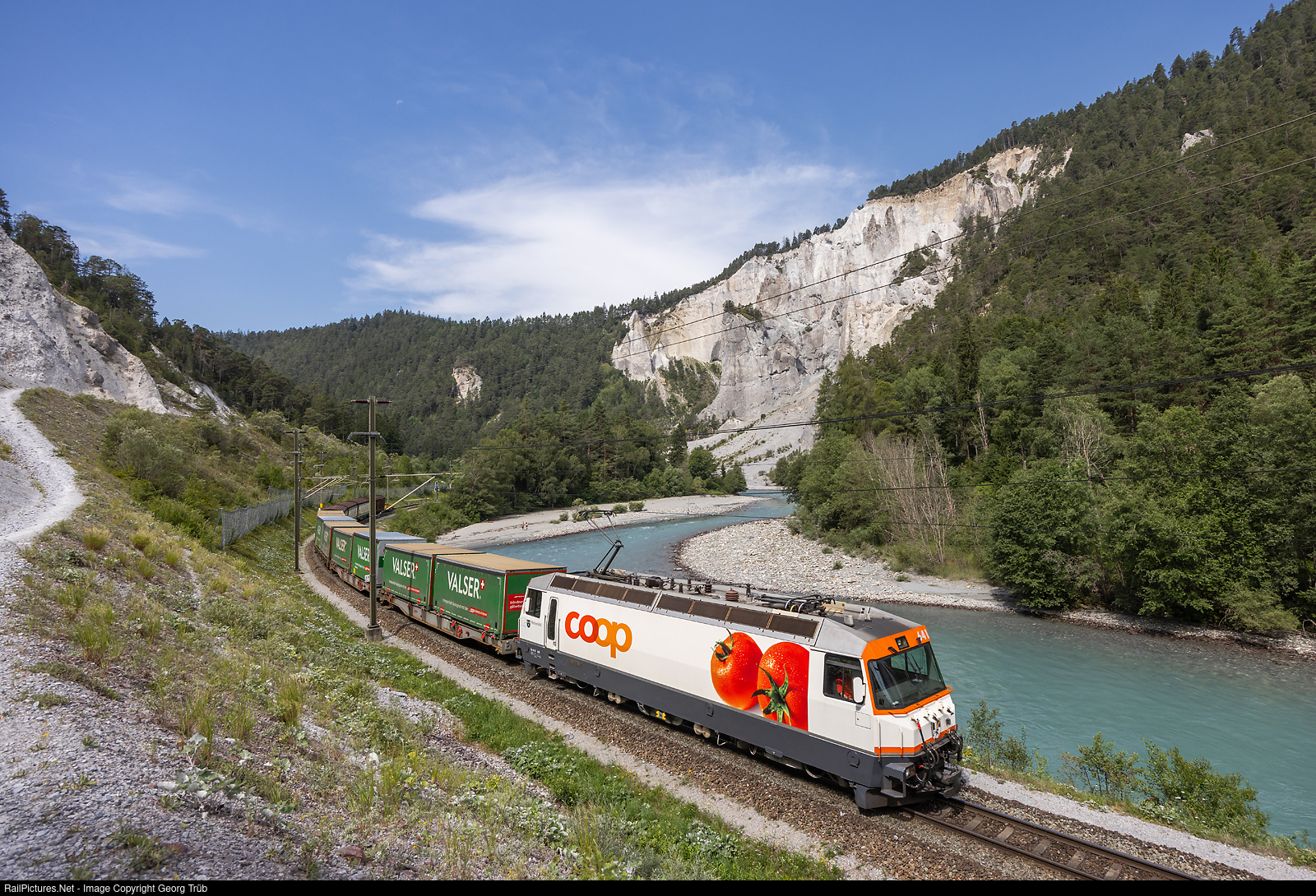 Rather unusual traction of the Valser water train 5732 from Ilanz to Untervaz and Landquart with Ge 4/4 III # 641 in the Coop publicity paint scheme, between Valendas-Sagogn and Versam-Safien. At the head of this freight train is a very large variety of traction units possible, from Ge 6/6 I "C-C" or Rhaetian Crocodile (for instruction of locomotive drivers) to Ge 4/4 I, Ge 4/4 II, Ge 4/4 III and "Allegra" multiple units ABe 8/12.