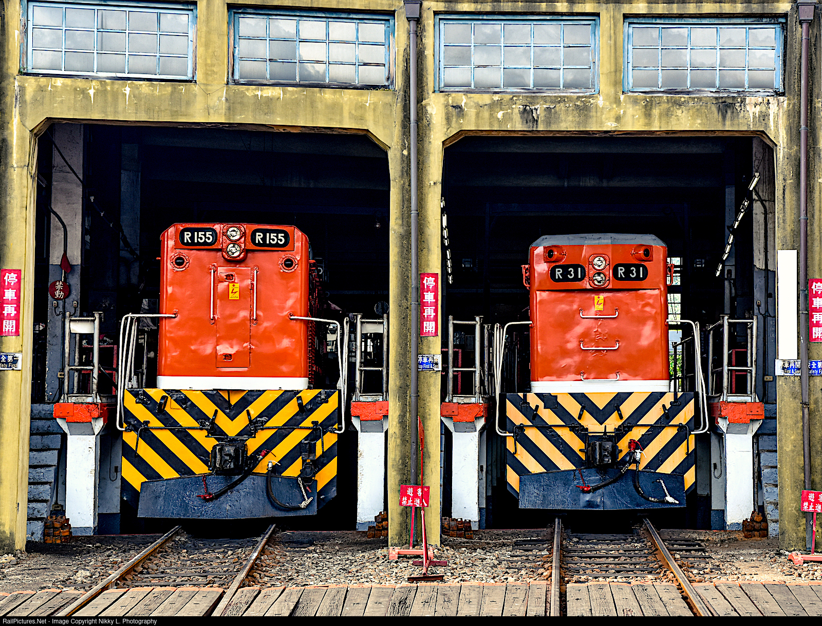 | Two locomotives idle in the roundhouse at Changhua Yard. This location remains as the last roundhouse of its kind that holds active revenue service locomotives in East Asia. |