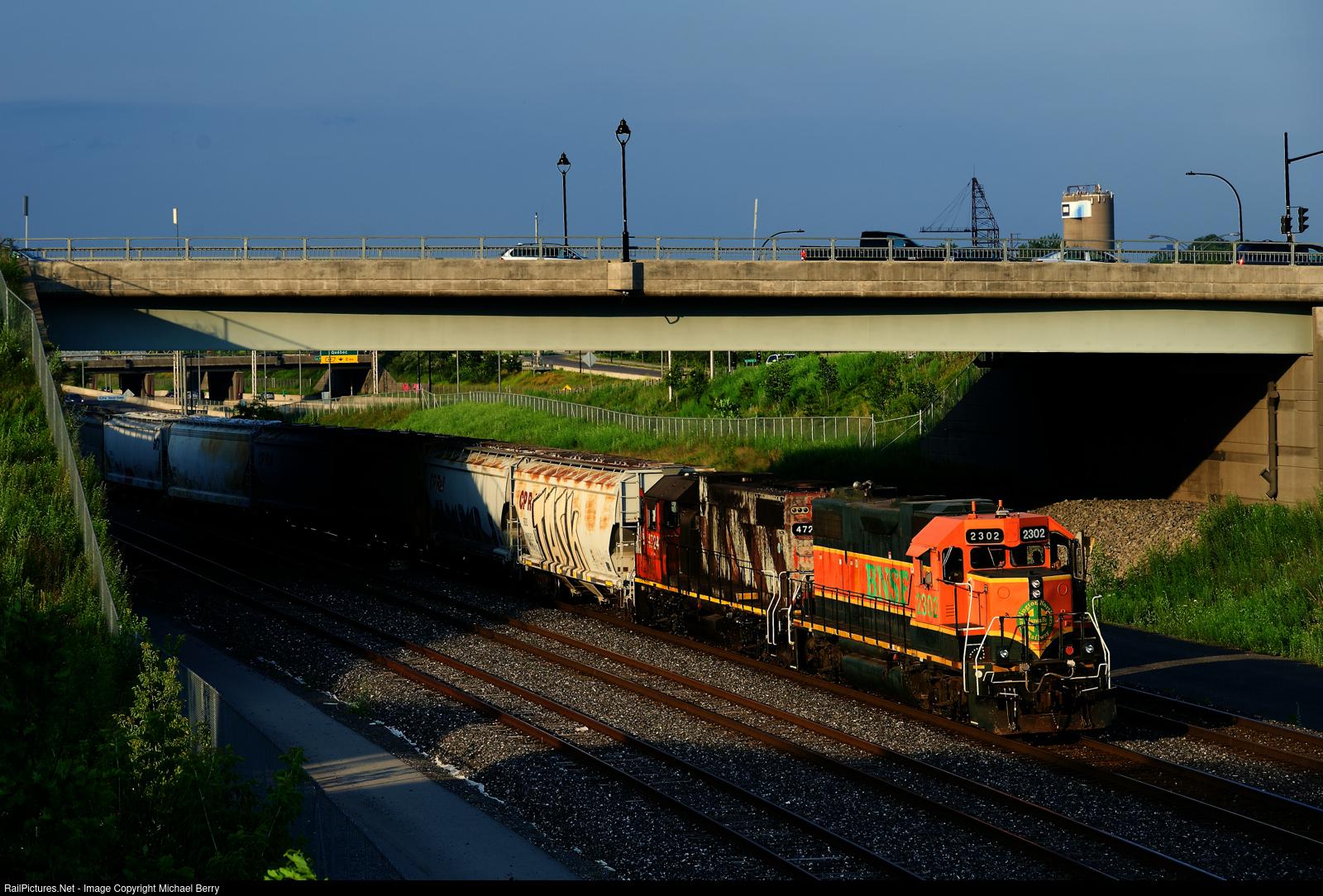 | BNSF Geeps on CN. In a surprising development, a number of BNSF Geeps are in local service on CN, apparently repaying horsepower hours. Here BNSF 2302 leads CN 596 as it crosses over from the Freight Track to the North Track at Turcot Ouest with traffic for Taschereau Yard. |