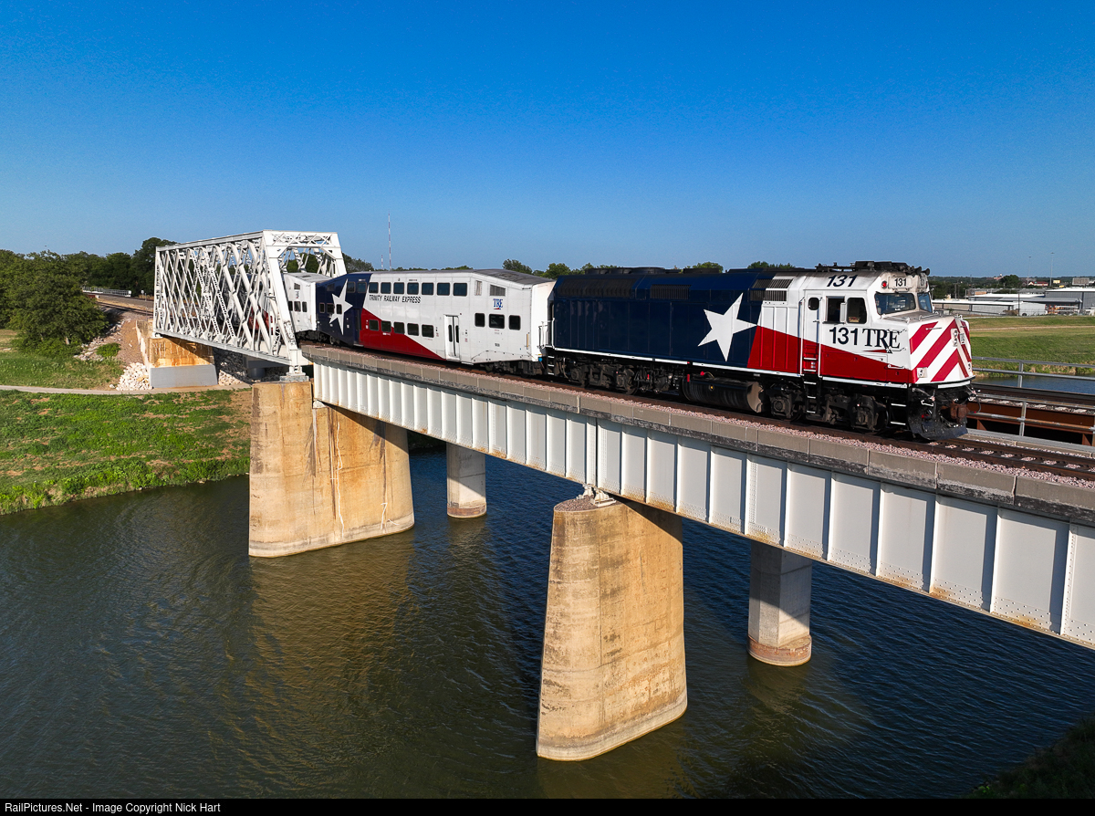 | TRE F40PH #131 leads train #2949 across the Trinity River as it slows for downtown Fort Worth. A former Amtrak unit built in 1977, 131 is a recent addition to the Trinity roster within the last few years. |