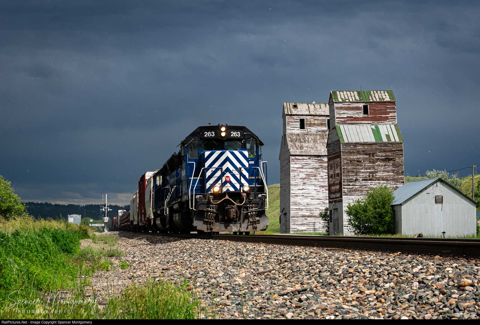 | Under threatening skies, the engineer of MRLs ‘Bozeman Bullet’ has the throttle open on MRL 263 as they blast through Reed Point, Montana |