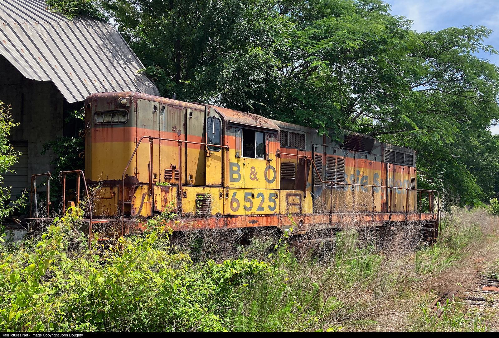 | It seems to be only a matter of time before the former Chessie System B&O 6525 will be completely enveloped in weeds and brush as it rusts away in Athens, Georgia. |