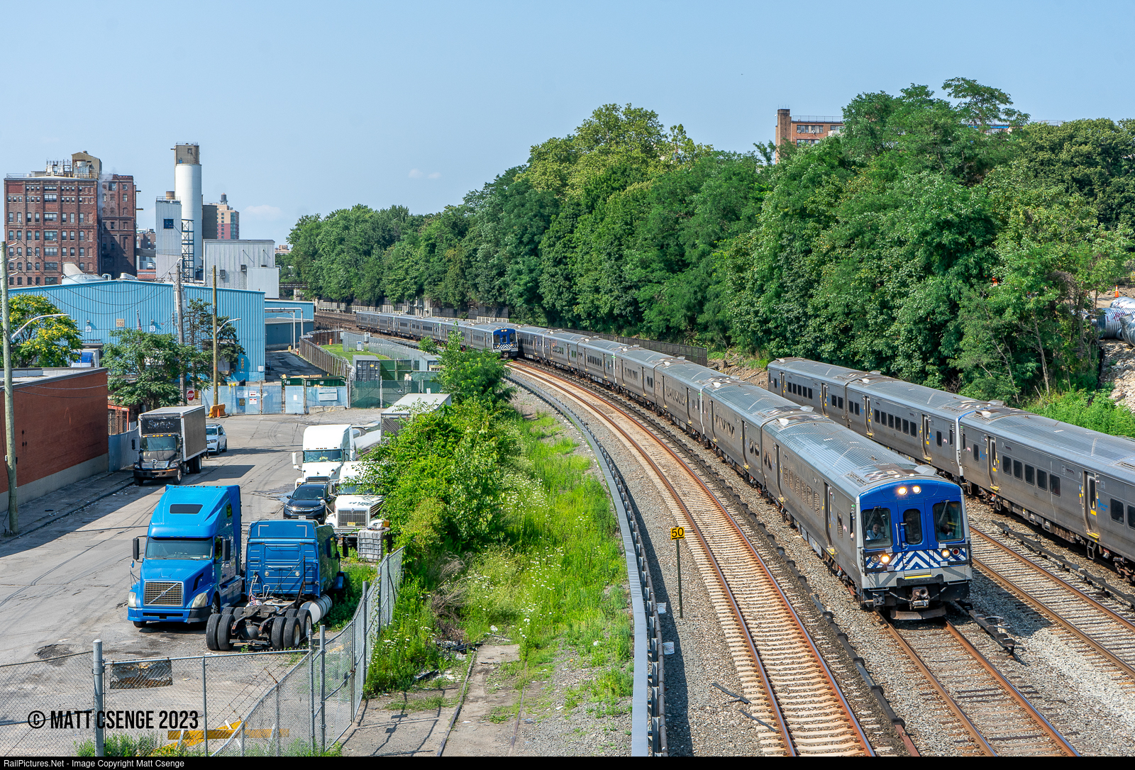 Metro-North Railroad M7A no. 4130 (Bombardier, 2004-2006) is the lead unit on train 2766, one of three Hudson Line trains seen passing north of Ludlow Station. Two are in revenue service, and one is a non-revenue move for peak service.