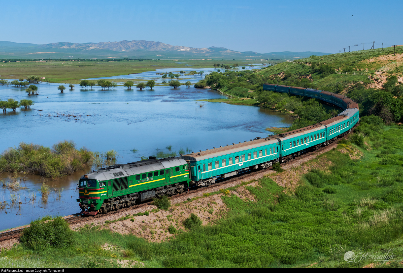 The appearance of the flooded Kharaa river basin after heavy rainy days. Near Tsaidam station, the north part of the Trans-Mongolian railway. Join the Trans-Mongolian railfanning tours: monrailpic@gmail.com