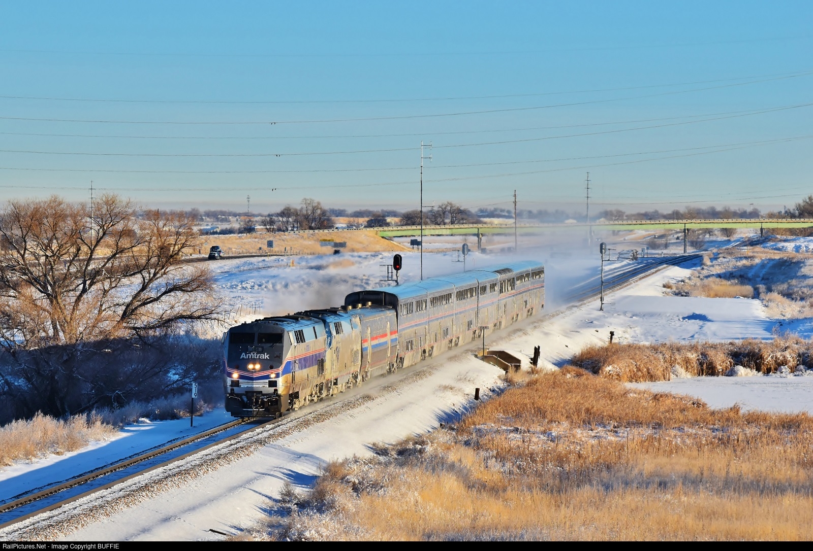 The California Zephyr kicks up the snow as it runs west on the Brush Sub towards Denver, Colorado.