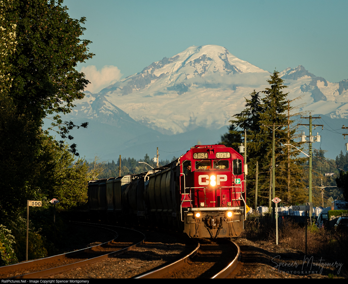 | Under Mount Baker, CP A84-05 is racing home with veteran GP38-2, 3094 leading. |
