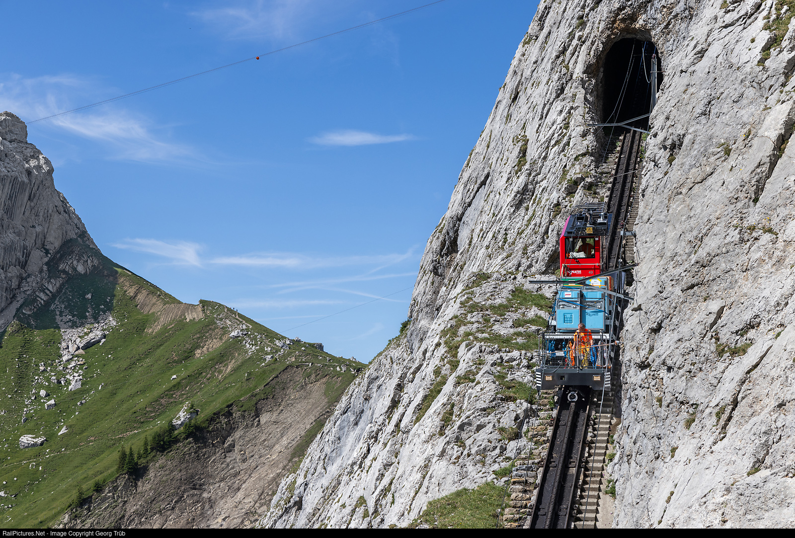 The new cogwheel service railcar Xhe 2/2 # 49 of the world's steepest cogwheel railway, the Pilatus Bahn, running down as part of train 12 in the Eselwand (donkey wall) on a grade of 48 %. This new vehicle, delivered from StadlerRail in spring 2023, can load up to 5 tons, the maximum weight when loaded is 17 tons. The individual platforms can be changed in their inclination by remote control, and the mounting of a small crane is possible on each one. Technically, with regard to underframe and drive, it largely corresponds to the new Bhe 2/2 # 41 to # 48 passenger railcars. The Pilatusbahn, opened in 1889, has a maximum grade of 48 % with the unique Locher cogwheel system, the gauge is 80 centimeter. Most of the track, rails and racks date back to the time when the railroad was built.