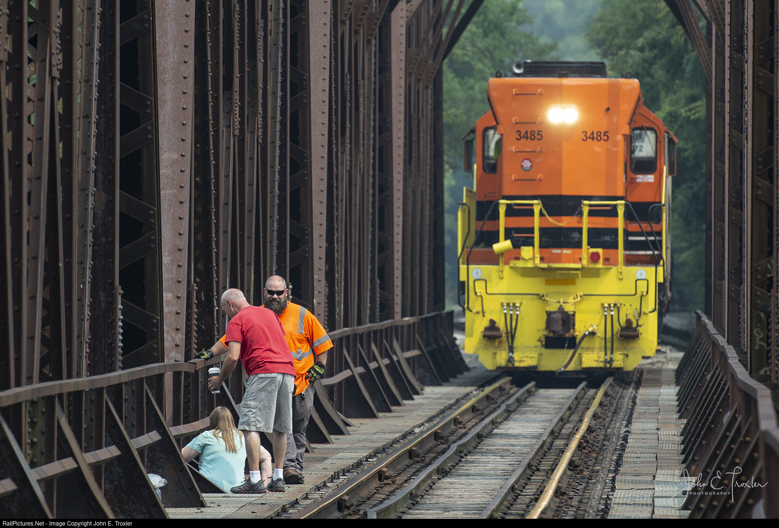 | The conductor of the TPW local politely requests a couple of trespassers who were fishing on the former PRR bridge to leave the premises so the local can proceed southbound to work industries located in Clymers, IN. |
