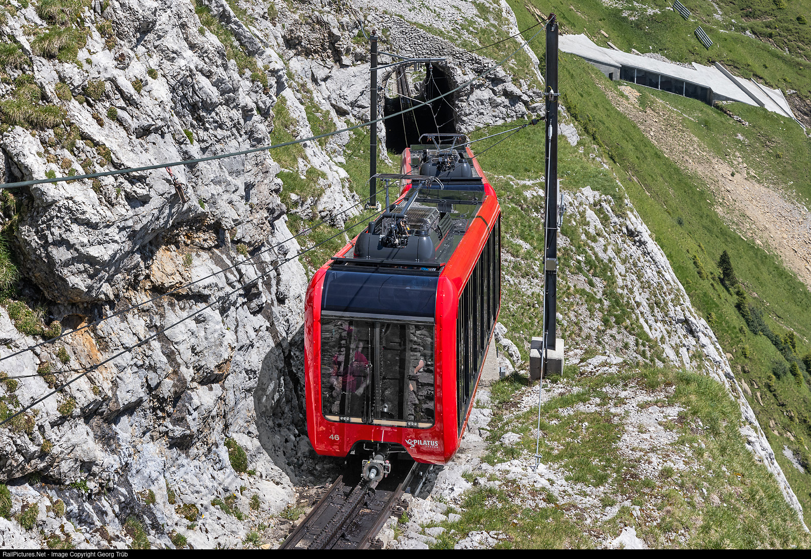 | Coupled cogwheel railcars Bhe 2/2 # 46 and # 43 of the Pilatusbahnen in multiple control are running up through the Eselwand (doneky wall) on a grade of 48 % as part of train CC 19 from Alpnachstad to Pilatus Kulm. The Pilatus Bahnen, world's steepest cogwheel railway, got 8 of this new railcars from StadlerRail and Calag in 2022/2023, replacing all railcars of 1937/1960/1967. |