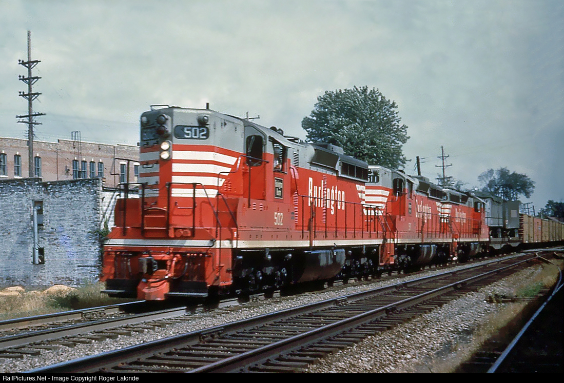 Rolling through Sandwich, Illinois on October 01, 1959 a westbound Burlington freight is propelled by a trio of Chinese Red high-nose SD24's on the point. Here U.S. Route 34 parallels the CB&Q main and provides numerous locations to photograph the busy double-track thoroughfare of the Burlington. Photo by Max Zimmerlein, from my collection.