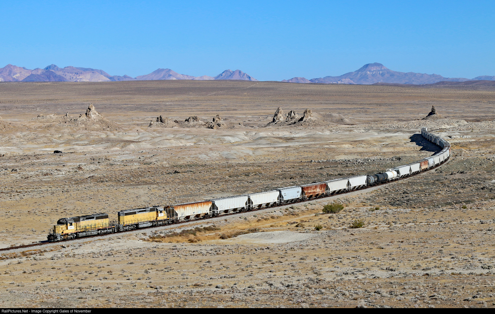 | With an unusual 2 set as opposed to the normal 3-7, Trona's afternoon job is in full dynamics as they wind down the hill towards the storage yard at Oxy. Behind them are a small portion of the famous Trona Pinnacles. On a day where the temperature was 107 during this shot, the landscape looks like something off another planet! |