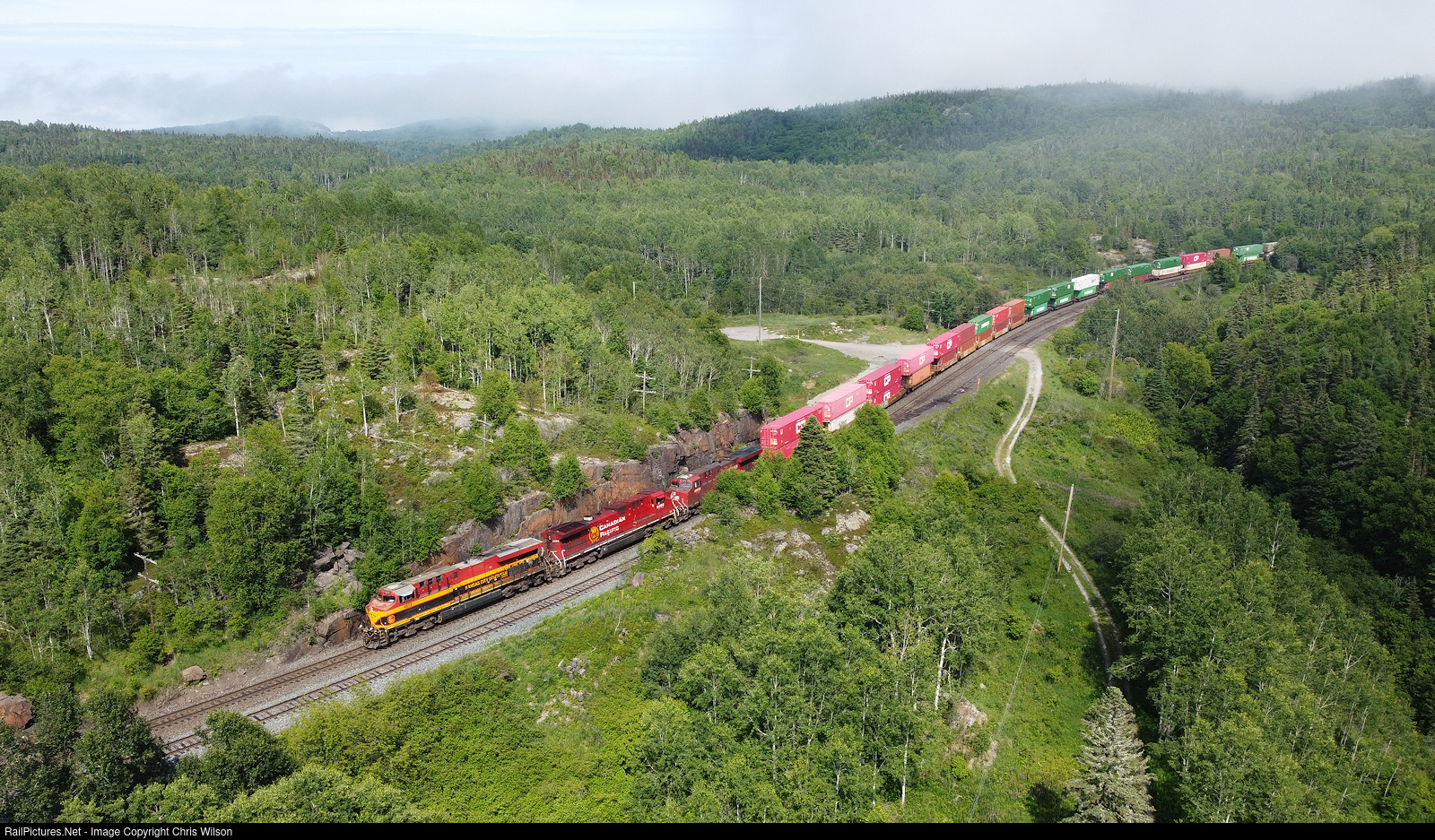 | KCSM 4879 is the first Belle to lead a train across the Heron Bay Sub after the merger. Here KCSM 4879, CP 8066, CP 8952 and mid train DP KCS 4111 haul 11427ft of freight up the hill thru Coldwell. Naturally the North Shore of Lake Superior was filled with coastal fog! |