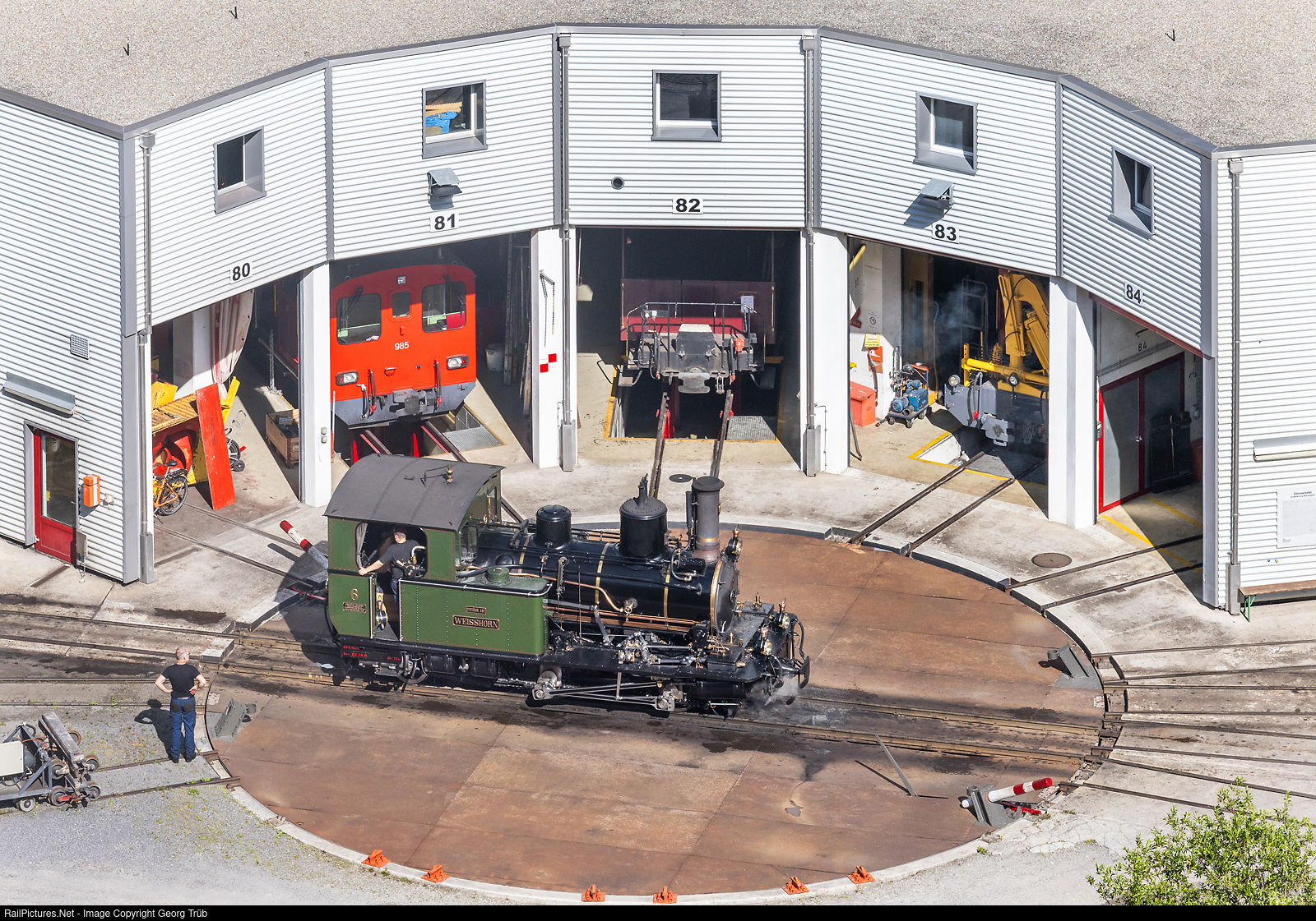 The small cogwheel steamlocomotive HG 2/3 # 6 "Weisshorn" of the Dampfbahn Furka Bergstrecke (DFB) is on the turntable of the depot in Realp, beeing prepared for the passenger extra train 1141 to Gletsch. The locomotive was built by the SLM in 1902 for the Visp-Zermatt-Bahn (VZ). In 1992, when the first part of the line over the Furka pass from Realp to Tiefenbach was inaugurated by the DFB, the HG 2/3 # 6 was the first and only steamlocomotive, then in blue paint scheme.