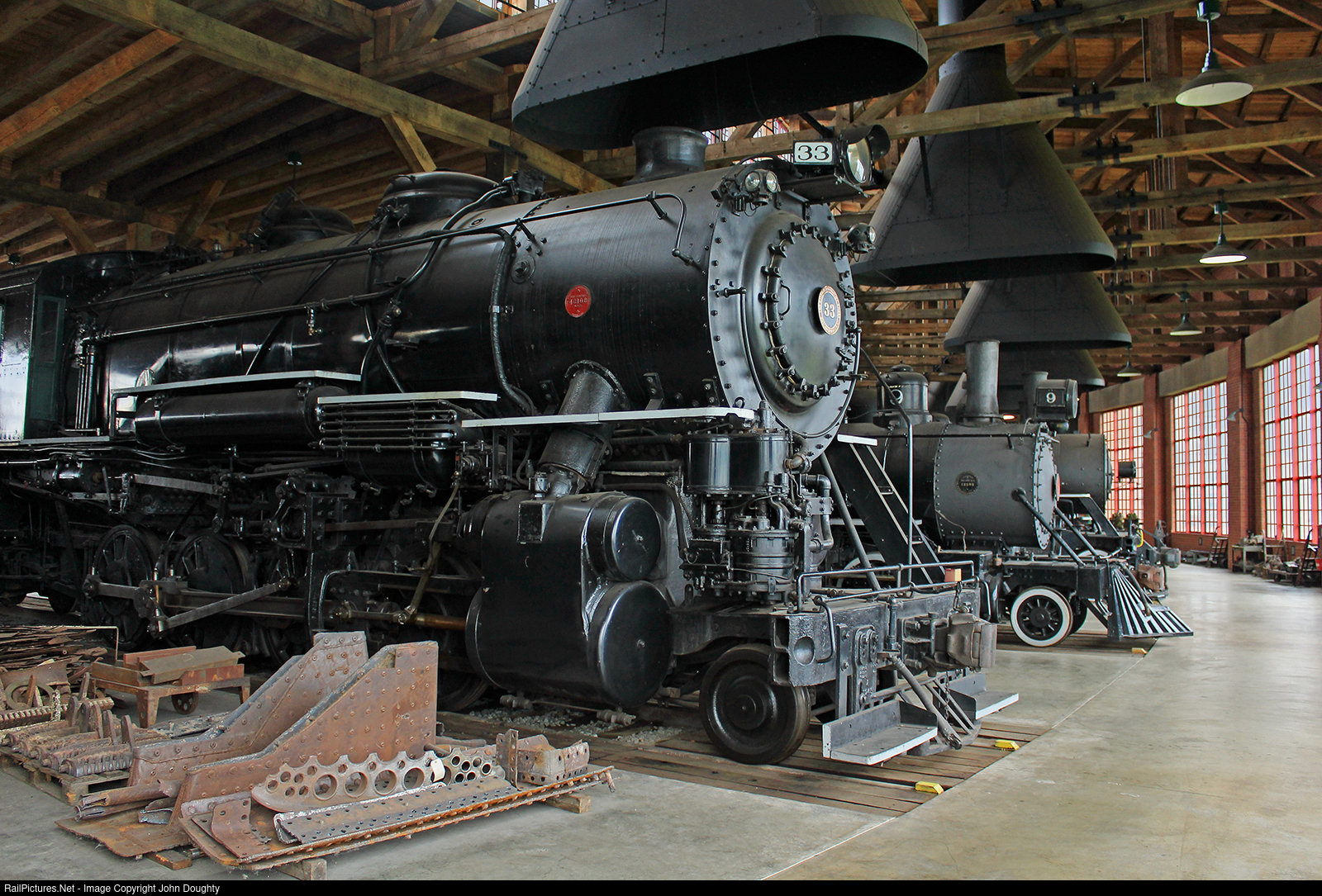 | Lake Superior & Ishpeming 2-8-0 No. 33 sits inside the Age of Steam Railroad Museum roundhouse in Sugar Creek, Ohio. Sitting next to it is McCloud River 2-6-2 No. 9. There is quite a impressive number of steam locomotives located at this museum, well worth a visit. |