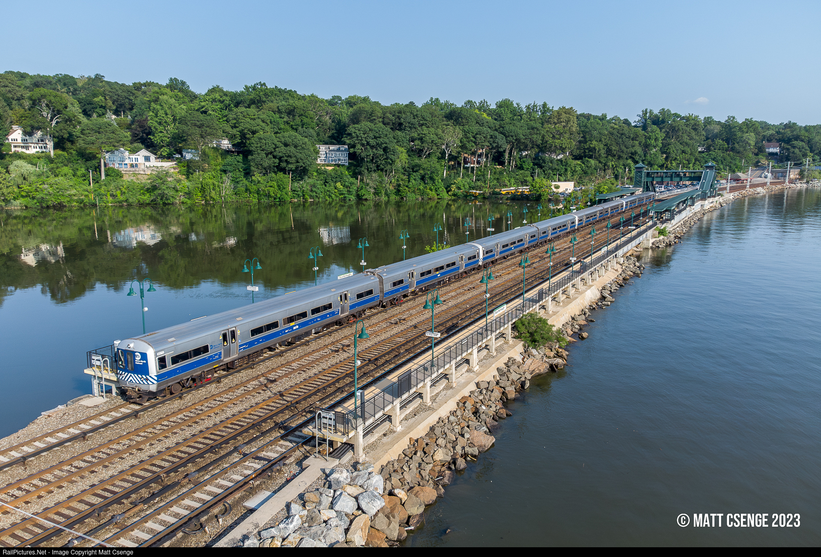 Metro-North Railroad M3A no. 8070 (Budd, 1983-1985) is the lead unit on Hudson Line train 755 to Croton-Harmon, seen stopped at Scarborough Station. While other stations on the line are directly adjacent to the river, Scarborough is the only one to have water on both sides! The railroad took an offshore route here, cutting off Kemey's Cove rather than proceeding inland.