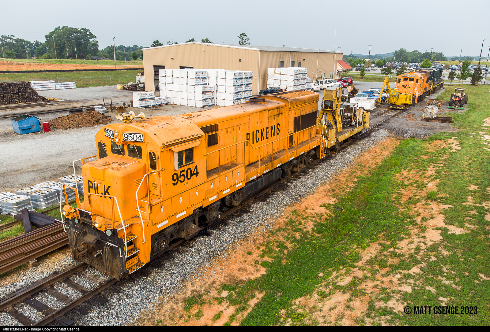Pickens Railway U18B no. 9504 (GE, 1973-1976) is seen with other locomotives and maintenance equipment at the railroad's shop facility in Gluck, SC. U18B no. 9502 and former CSX B40-8 no. 5960 (GE, 1988-1989) can be seen in the background.
