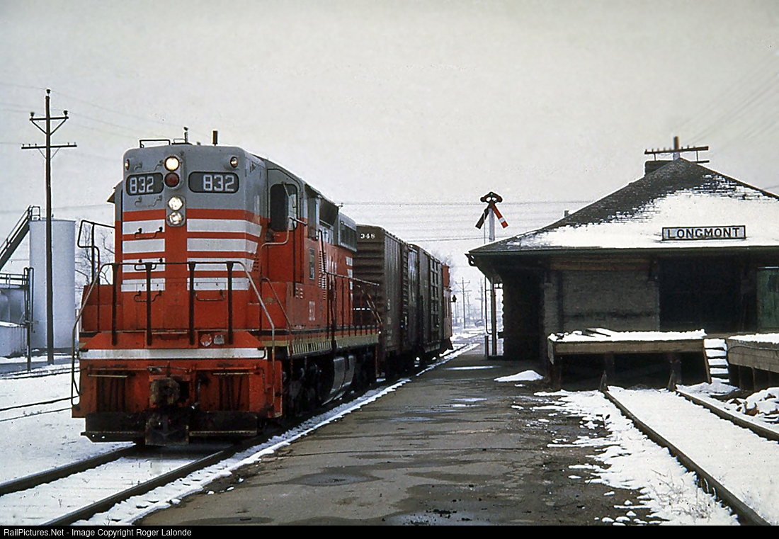 C&S SD-9 832 with only a short local in front of the Longmont depot, the crew was resting before returning to Broomfield on February 21, 1968. Photo by Ken Crist, from my collection.