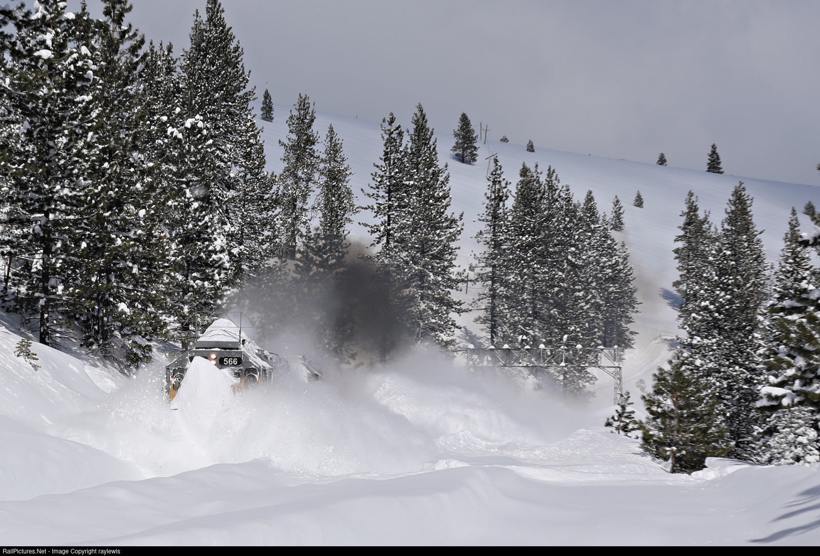 | This was a winter! This winter on Donner was indeed challenging and epic. Not only for railroaders but also railfans. Access on Donner in the winter is always tough, especially parking. With a small slide at Shed 47, the snow was piling up. With I80 closed we made the decision to hike back into Andover. In this shot UP 566 is pushing quite a bit of snow in, one of my very few photos of Donner in the snow and sunlight. |