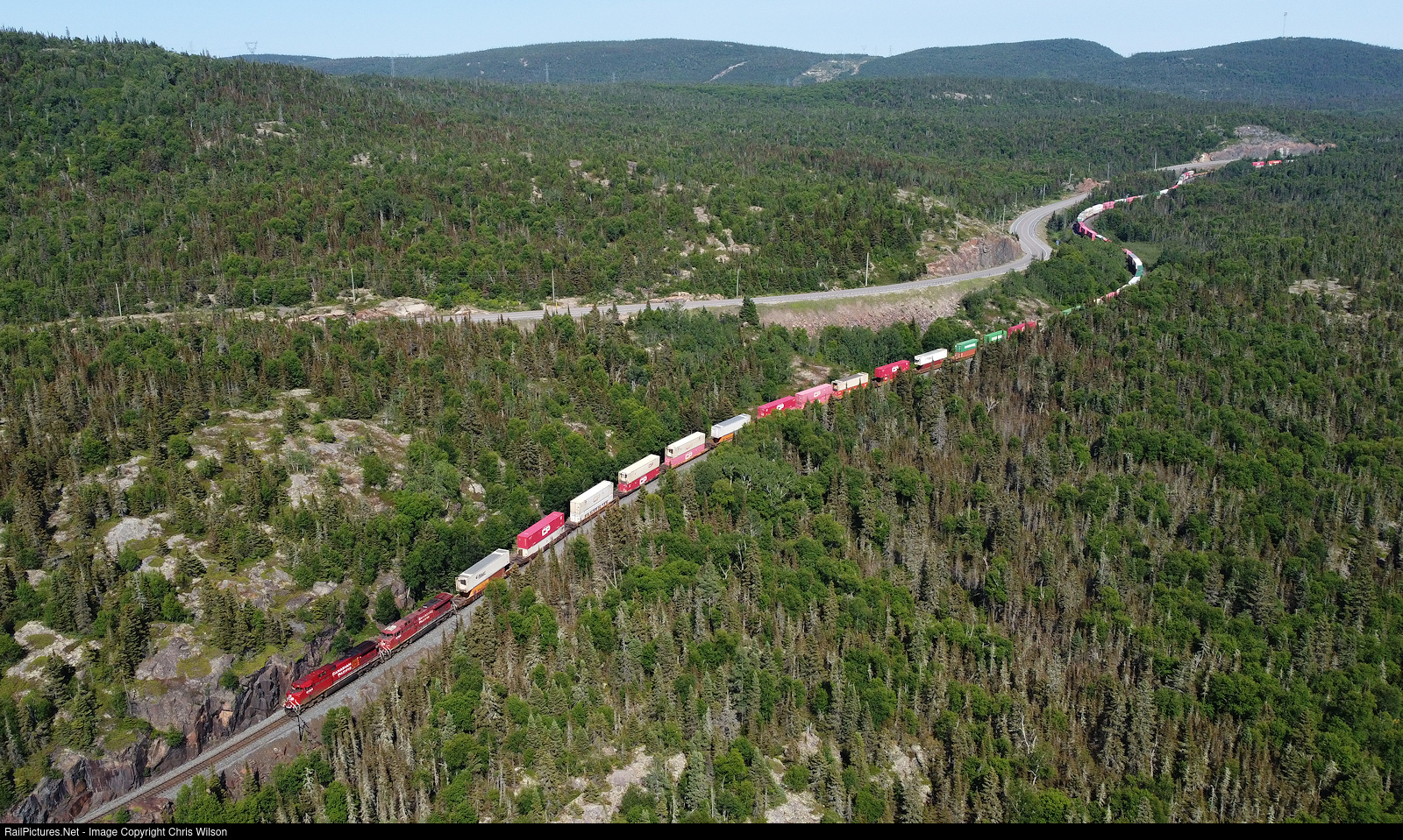 | CPKC's Toronto, ON to Vancouver, BC intermodal twists thru the rocky and rugged terrain north of Lake Superior. |