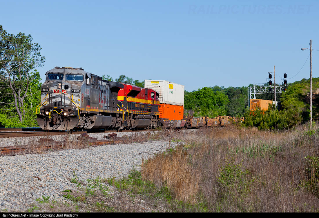 | Ridden hard and put up wet, KCSM 4569 is still chugging along, leading a priority (UPS) intermodal train into Atlanta ahead of schedule. |