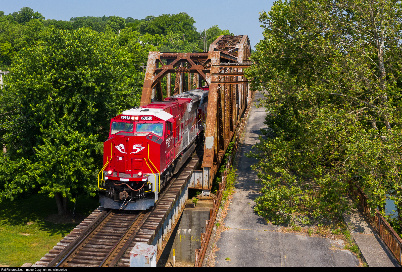 | The RJ Corman Kentucky Line's empty Alcan aluminum slab train crosses over the Kentucky River as it comes into Frankfort, Kentucky on a bridge that parallels an abandoned road bridge that once carried Broadway Street across the river. In the lead is the newest power to the railroad with a pair of former NS SD70M's wearing a special paint scheme for the company's 50th anniversary. |