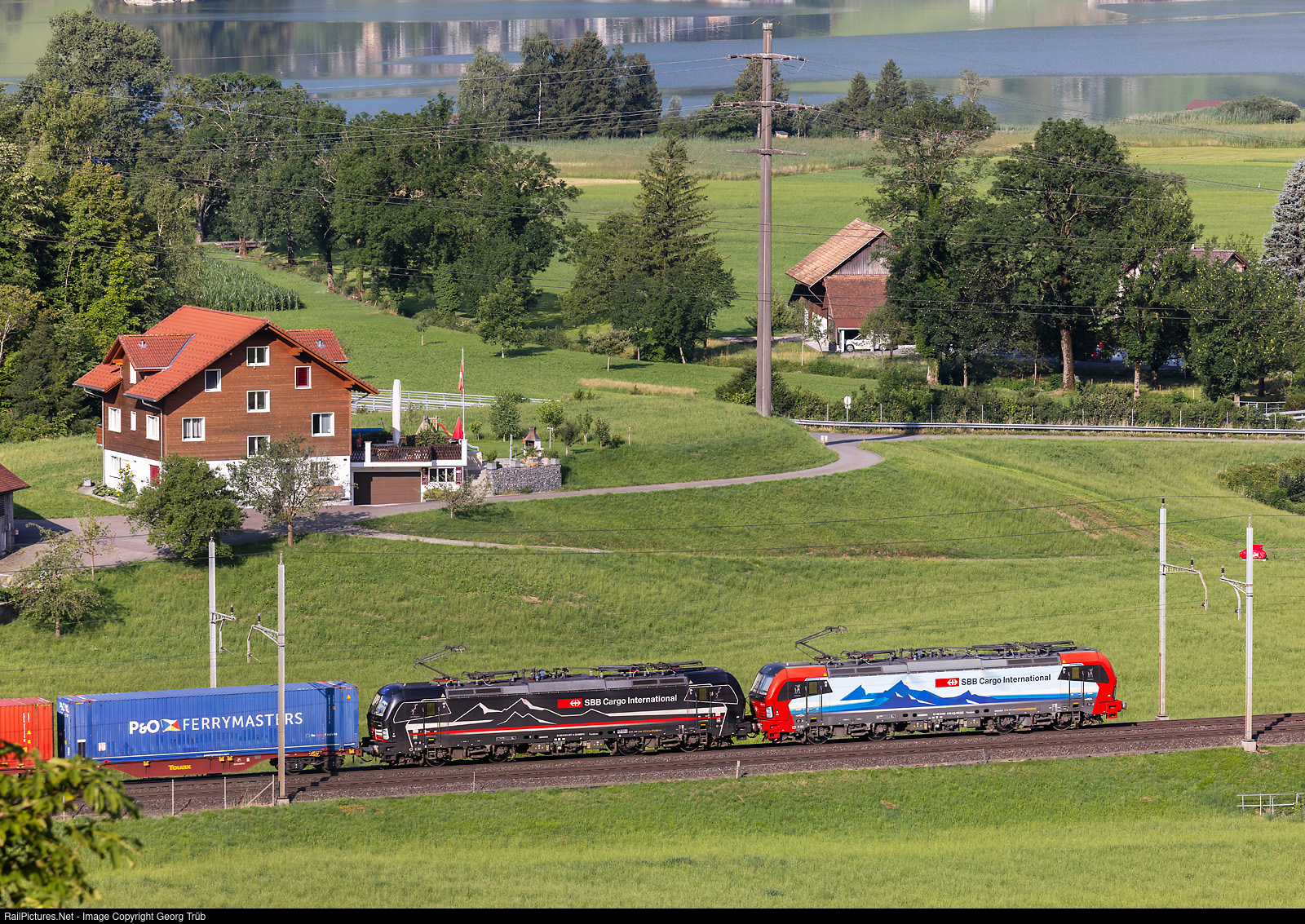 Siemens "Vectron" 193 # 478 "Alppiercer" with name "Gottardo" and 193 # 657 "Shadowpiercer" with name of "Lago Maggiore" of the SBB Cargo International in multiple control pull the northbound intermodal train 40140 from Milano Smistamento/Italy via Chiasso-Ceneri and Gotthard Base Tunnel-Bözberg-Basel to Zeebrugge/Belgium, between Schwyz and Steinen. 193 # 478 is rented from the LokRoll leasing company, 193 # 657 from the MRCE - Mitsui Rail Capital Europe GmbH, München/Dispolok.