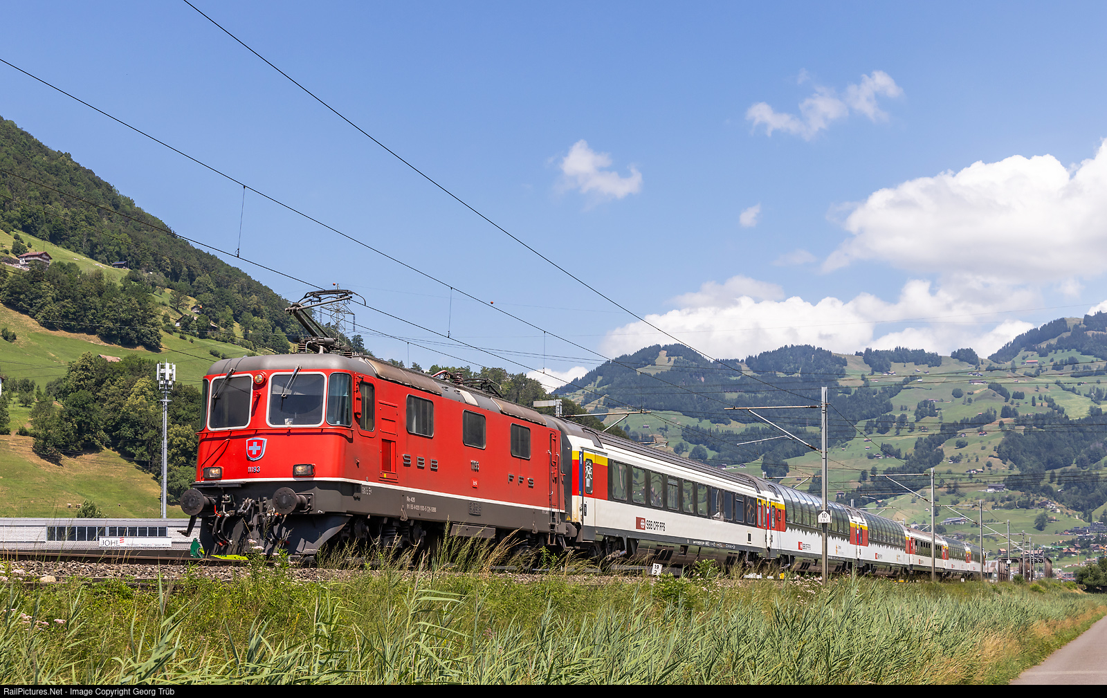 Re 420 # 193 (Re 4/4 II # 11193) of the SBB pulls the PE 3093 GOTTHARD PANORAMA EXPRESS from Arth Goldau over the Gotthard mountain line to Lugano, between Schwyz and Brunnen. The Re 4/4 II # 11193 got a new paint scheme and now also the factory plates and the type designation "Re 4/4 II" were reattached to the body sides. In the train are a first class Apm, mainly for the staff and material, then two panorama cars Apm, a second class Bpm with windows to open for photographers, and another two panorama Apm.