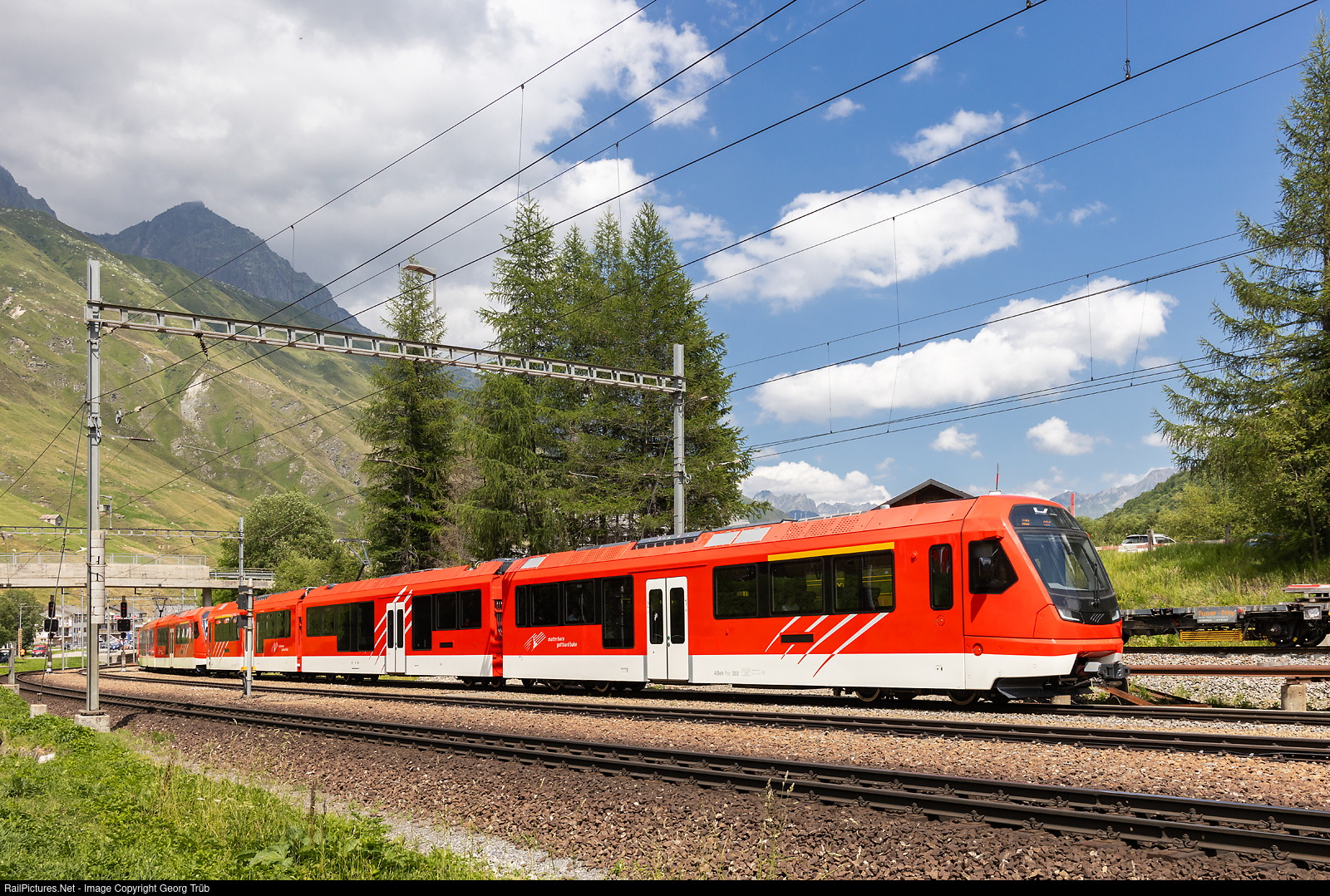 | New "Orion" cogwheel trains ABeh 8/12 # 302 and # 305 of the Matterhorn-Gotthard-Bahn in multiple control are leaving Realp as train R 553 of the line R43 from Andermatt to Brig-Visp. The MGB gets 12 of this new trains in the moment from StadlerRail, 25 more are on order. |