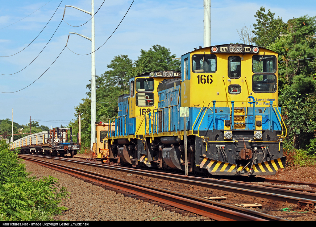 | Sitting in the siding at Greenlawn are MP15s 166 and 168 with a string of concrete tie cars behind. At the station a LORAM train is in the eastbound track. LIRR caboose 69 is