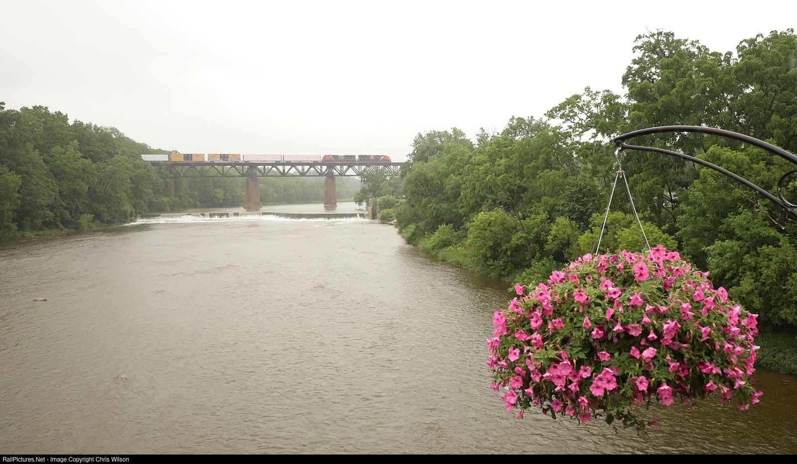 Winnipeg Symington, MB - Toronto MacMillan, ON train 302 heads across the Grand River in the pouring rain. Everything looks much more lush when the sky opens up!