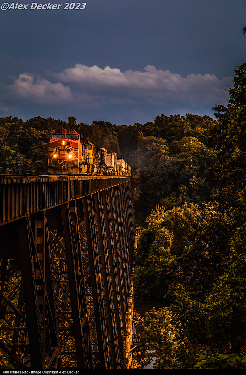 As severe storms start to roll in from the southwest, the sun peaks out from behind the clouds as 24X hustles across the James River with a consist that looks straight off of the Transcon, with a fairly rare Warbonnet in the lead. |