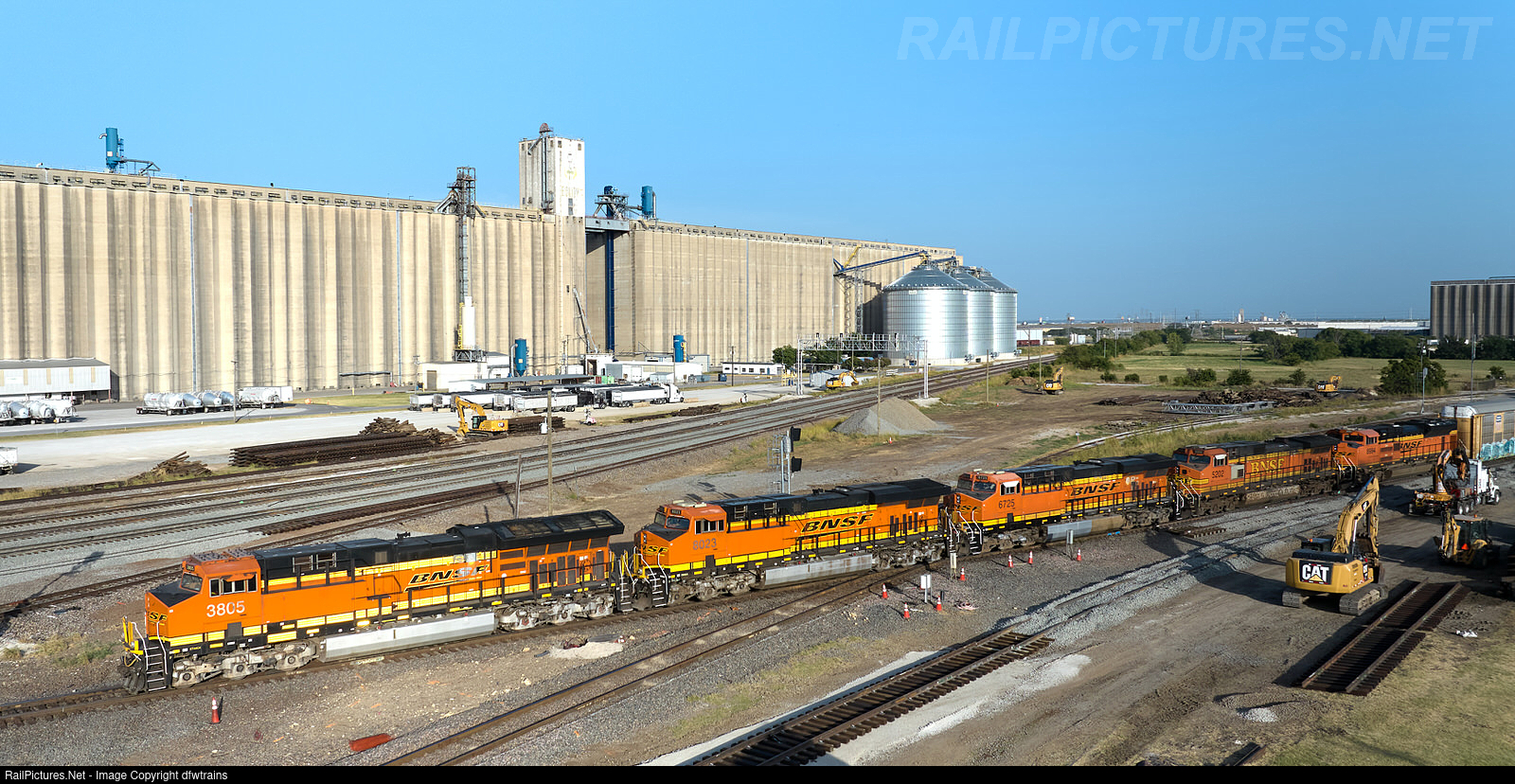 Crews work on laying new track as part of the diamond removal at Saginaw, Tx while a manifest from Cadet Yard, San Antonio, Tx to Galesburg, IL crosses the diamonds at Saginaw, Tx. With the track layout remodeling, BNSF expects speed increase for passenger trains to 79mph and freight to 55mph.