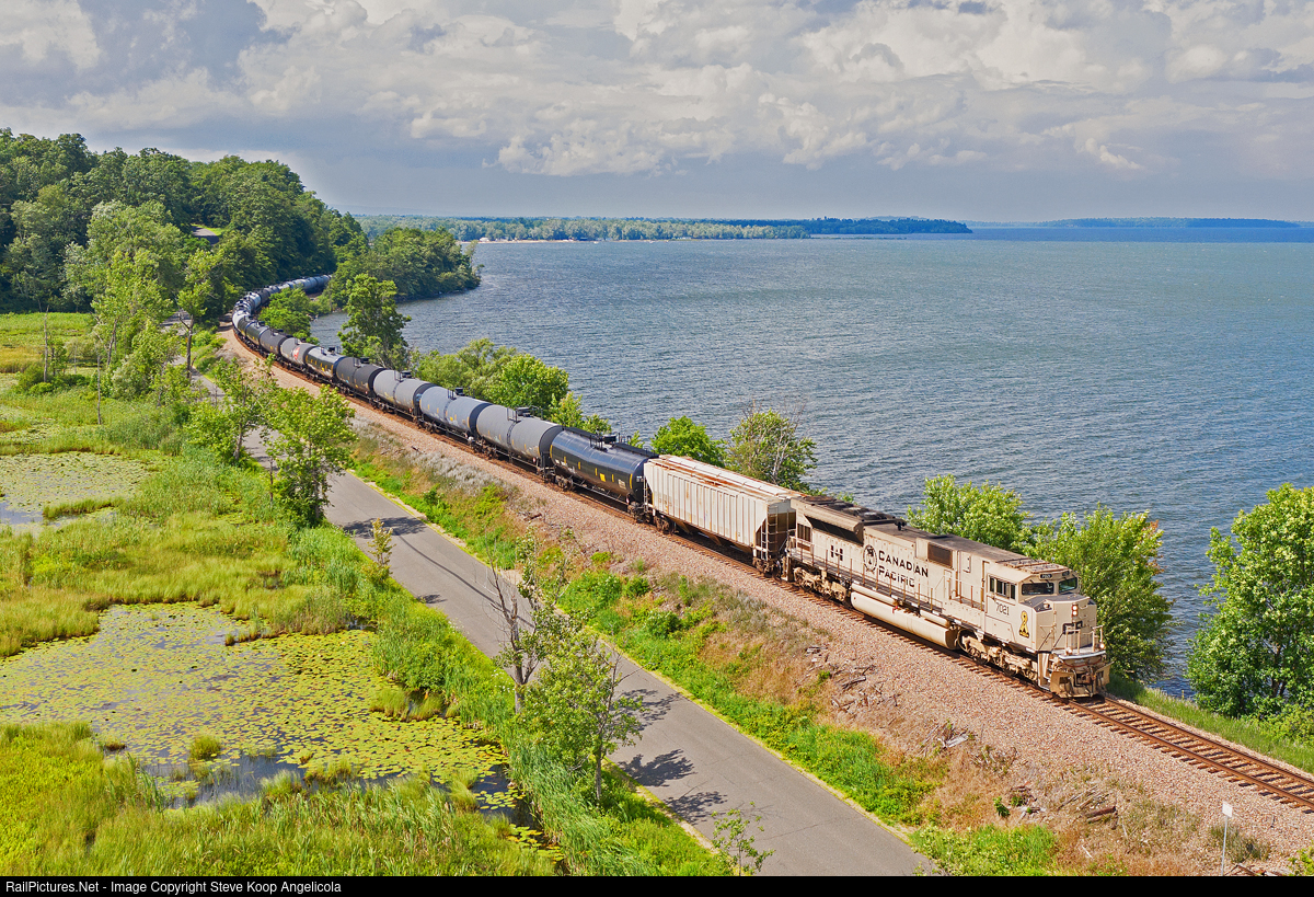 | Military Tribute Locomotive CP 7021 leads Canadian Pacific Kansas City Railway loaded ethanol train 528 at Wickham Marsh along Lake Champlain. 7021's paint scheme represents the colors of US and Canadian military vehicles used in Desert Storm and arid regions. |