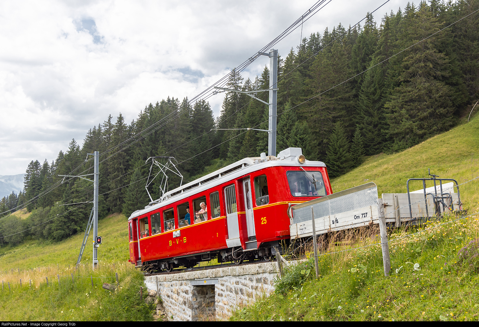 The Chemin de fer Bex-Villars-Bretaye (BVB), part of tpc (Transports Publics du Chablais) since 1999, celebrates its 125th birthday this year. The origin is the Chemin de fer Bex-Gryon-Villars-Chesières, whose first section from Bex to Bévieux was opened in 1897. To celebrate the anniversary, the "Flèche" rack-and-pinion railcar BDeh 2/4 # 25 will run every Wednesday, Saturday and Sunday during the summer from Villars to the Col-de-Bretaye and back as an additional train. The BVB purchased six of these elegant railcars with the numbers # 21 to # 26 from SLM and MFO between 1940 and 1946. Car # 25 was restored to its former livery and markings and is shown here pushing freight car Om # 727 on its way to the Col-de-Bretaye mountain station above Col-de-Soud.