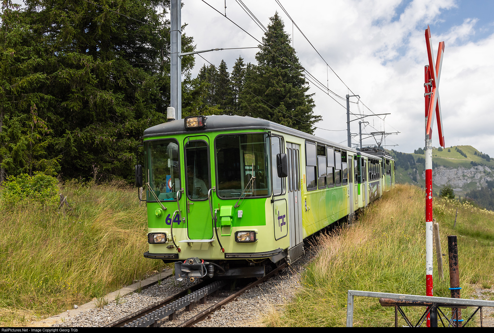 Cogwheel train 855 of the Transports Publics du Chablais (TPC) from Col-de-Bretaye to Villars-sur-Ollon, above Col-de-Soud. Leading is cab car Bt # 64, followed by cab car Bt # 62 and cogwheel railcar BDeh 4/4 # 82 (built 1977) in the rear. On this Abt cogwheel line, with a maximum grade of 17 %, the railcars are on the mountain side, pulling upwards.