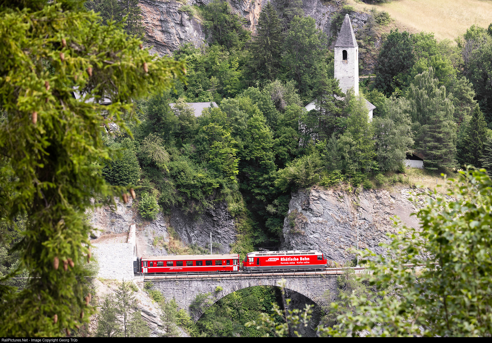 Interregio 1137 of the Rhaetian Railway from Chur over the Albula line to St.Moritz, with Ge 4/4 III # 647, is leaving the 300 meter long Mistail tunnel and crossing the 32 meter long Mistailtobel viaduct in the Schin gorge between Solis and Tiefencastel. Above the train, not visible for the passengers, is one of the oldest preserved churches of Switzerland, St. Peter of Mistail from the 9th century. The church of St. Peter Mistail is a Carolingian triple apse church in Alvaschein (municipality of Albula/Alvra) and the only unbuilt triple apse church in Switzerland. The exact date of origin is not known, but it is assumed to be around the year 800. Mistail is indirectly mentioned in the year 823 in a letter of complaint from Bishop Victor of Chur to Louis the Pious. The monastery is first mentioned in a document in 926 in a deed of donation from Henry I to Bishop Walde. The fact that the monastery is named and has the same patronage as the convent in Cazis leads to the assumption that Mistail was founded by the convent in Cazis.