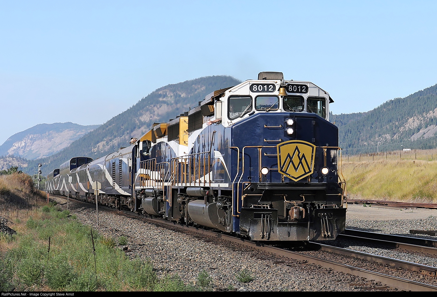 GP40-2L(W) 8012 leads Rocky Mountaineer's "First Passage West" tour train through Pritchard.